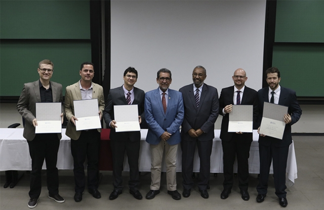 Novos membros da ABC: Felipe Bohn, Bartolomeu Cruz Viana Neto, Roberto Cesar Pereira Lima Junior, Luiz Felipe Cavalcanti Pereira e Pierre Basílio Almeida Fechine, acompanhados do vice-presidente regional da ABC-NE&ES, Jailson Bittencourt e do vice-presidente regional da ABC-SP, Oswaldo Alves.
