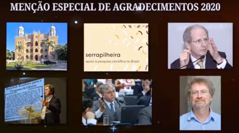 Foram homenageados a Fiocruz, o presidente da SBPC Ildeu Moreira, o Instituto Serrapilheira, o senador Izaci Lucas, o presidente da ABC Luiz Davidovich e o presidente do Conselho de Administração da Empresa Brasileira de Pesquisa e Inovação Industrial (Embrapii), Pedro Wongtschowski.