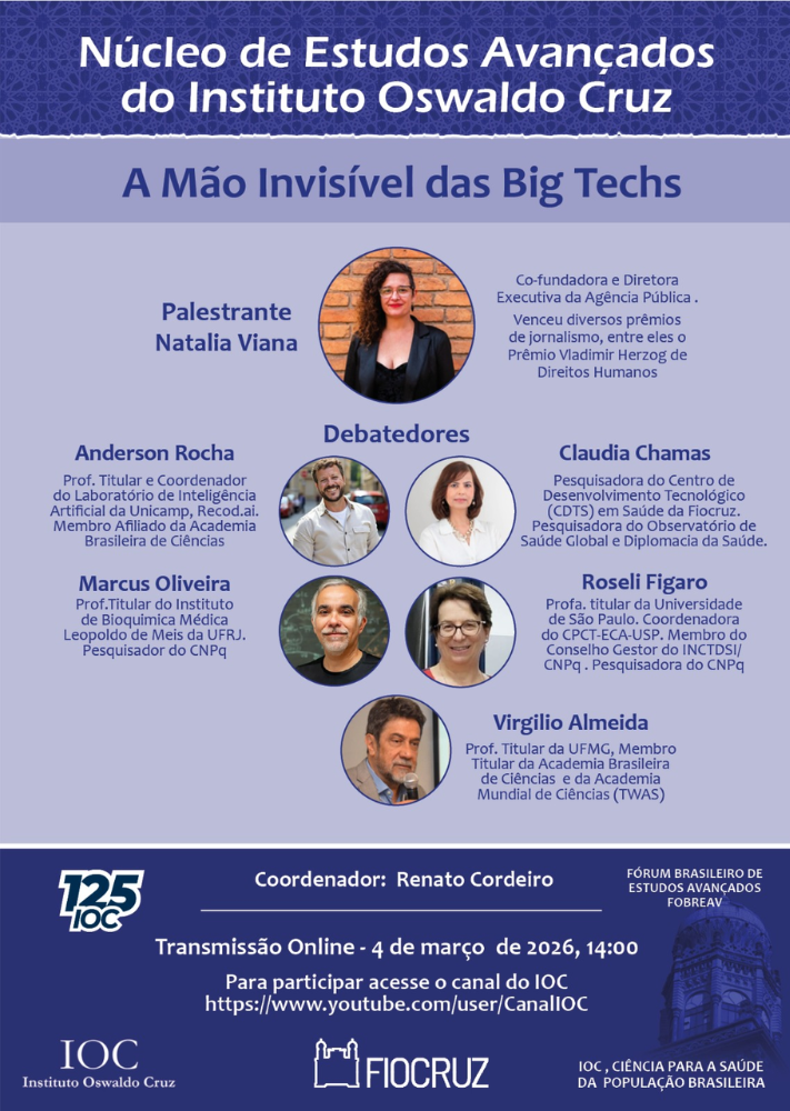 No dia 4 de março, 4a feira, às 14h, o Núcleo de Estudos Avançados do Instituto Oswaldo Cruz, ligado ao Forum Brasileiro de Estudos Avançados (Fobreav), promove palestra da jornalista Natalia Viana, co-fundadora e diretora-executiva da Agência Pública, vencedora de diversos prêmios da área, inclusive o prêmio Vladimir Herzog de DIreitos Humanos.